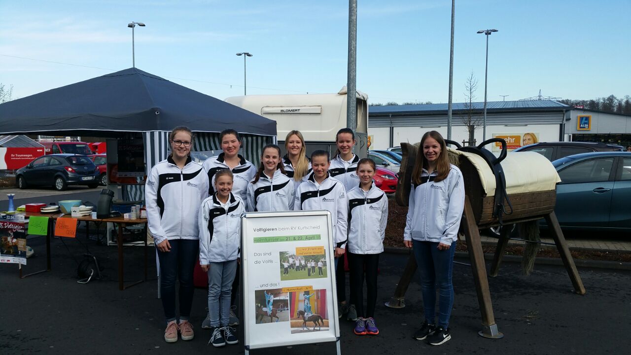 Das ist die Gelegenheit für den RV Kurtscheid auf das am 21. und 22.04. anstehende Heimturnier hinzuweisen. Mit einem 3×3 Meter Zelt, dem Übungs-Pferd „Freddy“, Waffeleisen, Kaffeemaschine und einem großen Plakat ausgerüstet, begrüßen die jungen Sportler die Kunden des REWE-Markt.