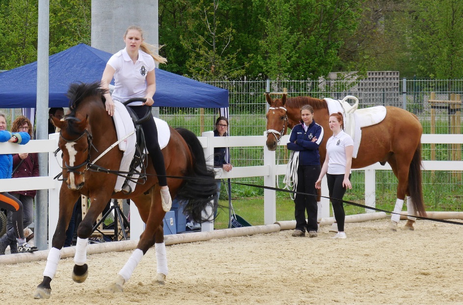 Eine Stunde lang zeigten wir verschiedene Impressionen rund ums Training. Dazu gehörten Pflichtelemente auf Dobby im Galopp sowie einzelne Kürübungen im Schritt, Turn- und Kraftübungen auf dem Boden und eine Kür auf unserem Freddy.
