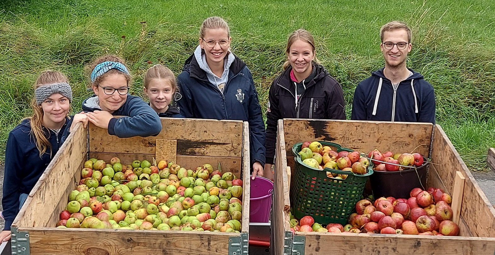 Oktober 2021. Pünktlich wie immer – und wie schon in den Jahren 2017, 2018, (2019 gab´s keine Äpfel) und 2020 – ging es wieder in die Streuobstwiesen rund um den Birkenhof zum Fallobstsammeln. Am ersten Oktoberwochenenden trafen sich die Volti-Sportler aus den Turniergruppen mit den Trainerinnen Julia Jäger und Nikola Becker und nahmen „die Arbeit“ auf.
